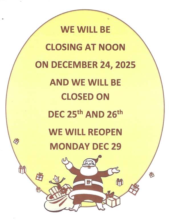 We will be closing at noon on December 24th.